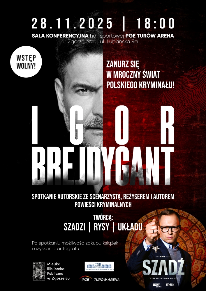Miejska Biblioteka Publiczna zaprasza na wyjątkowe spotkanie autorskie z Igorem Brejdygantem – pisarzem, scenarzystą, reżyserem i aktorem, autorem takich powieści, jak „Paradoks”, Szadź”, „Rysa”, „Układ”, „Wiatr” czy „Spirala”. Odbędzie się ono 28 listopada, o godzinie 18.00, w sali konferencyjnej Hali Sportowej PGE TURÓW ARENA, przy ulicy Lubańskiej 9a w Zgorzelcu.